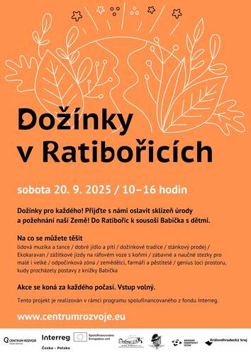 V sobotu 20.9. si budeme užívat lidové muziky a tanců, dobrého jídla a pití, dožínkových tradic, místních zemědělců, farmářů a pěstitelů, Ekokaravanu, výstavy exponátů z Muzea v Radči a také jízdu na ráfovém voze a v panském kočáru, zábavné a naučné stezky pro malé i velké, které zaštiťují organizace věnující se vzdělávání s environmentální tematikou a také genius loci prostoru, kudy procházely postavy z knížky Babička. Tak přijďte pobejt!