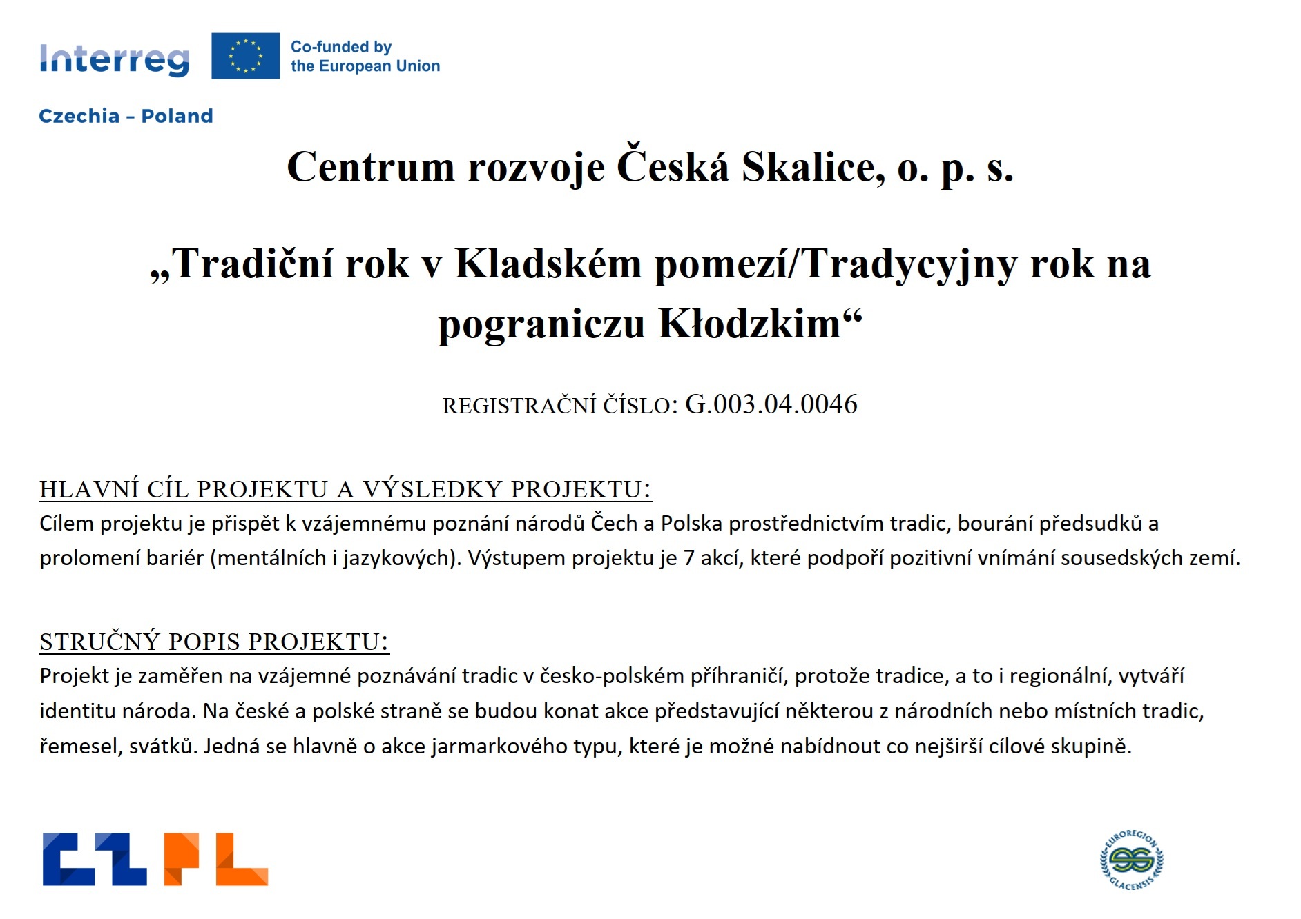 "Tradiční rok v Kladském pomezí"/„Tradycyjny rok na pograniczu Kłodzkim” , reg. č. žádosti: G.003.04.0046, je spolufinancován z prostředků EFRR prostřednictvím Euroregionu Glacensis.