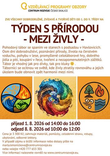 Užijeme si týden v inspirativním prostředí učeben Vzdělávacích programů OBZORY, a hlavně v přírodě v okolí Česká Skalice. Budeme bádat nad přírodními souvislostmi, budeme tvořit z přírodních materiálů a prožívat dobrodružství při hrách.